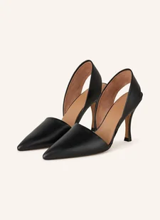 Gładka skóra. Pasek na pięcie. Zwężający się nosek. Kolorystycznie dopasowany obcas szpilka. Gładka podeszwa zewnętrzna. Wyprodukowano w Hiszpanii
