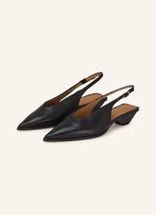 Delikatnie groszkowana skóra. Pasek na piętę z klamrą ze szpilką. Zwężający się nosek. Powlekany obcas o rzeźbionym stylu w tym samym kolorze. Wyprodukowano w Hiszpanii