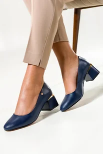 Granatowe czółenka skórzane damskie na ozdobnym klocku złota ozdoba Casu SL24X2-N-38