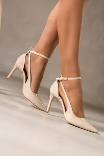 Jasnobeżowe czółenka damskie lakierowane szpilki wycięcia na cholewce pasek wokół kostki Carla 641-8