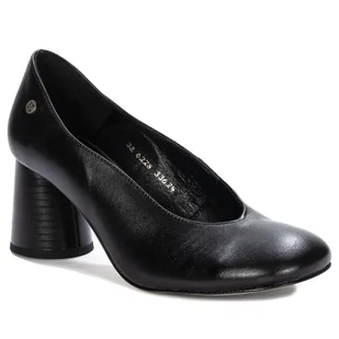 Maciejka Czółenka damskie na słupku skórzane czarne Klasyczne czółenka damskie marki Maciejka na słupkowatym obcasie to fason, który musi posiadać każda kobieta lubiąca łączyć elegancję z wygodą. Cholewkę wykonano z miękkiej skóry naturalnej licowej w kolorze czarnym. Wnętrze również wyściełano skórą naturalną. Miękka, wyprofilowana, skórzana wkładka zapewnia maksimum komfortu. 7-centymetrowy obcas gwarantuje odpowiednie ułożenie stopy oraz doda kilka cennych centymetrów naszej sylwetce.