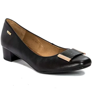 Maciejka Czółenka damskie skórzane Czarne+Czarny Krokodyl Klasyczne, damskie czółenka marki Maciejka na niewysokim obcasie to wzór, który musi posiadać każda kobieta lubiąca łączyć elegancję z wygodą. Cholewkę wykonano z miękkiej skóry naturalnej licowej w kolorze klasycznej czerni. Czubek buta zdobi piękna klamra wykonana ze skóry, która delikatną strukturą przypomina skórę krokodyla zakończona srebrnymi metalowymi okuciami. Wnętrze również wyściełano skórą naturalną. Miękka, wyprofilowana, skórzana wkładka zapewnia maksimum komfortu.