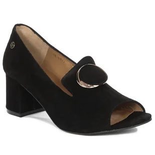 Maciejka Półbuty Damskie Skórzane Czarne Te czarne czółenka Maciejka to klasyczna elegancja w nowoczesnym wydaniu. Wykonane z wysokiej jakości naturalnego zamszu, zachwycają miękkością i subtelnym wyglądem. Charakterystycznym elementem jest stylowa, metaliczna ozdoba, która nadaje im wyjątkowego uroku. Stabilny, średniej wysokości obcas zapewnia komfort noszenia przez cały dzień, a otwarty nosek dodaje lekkości i sprawia, że buty świetnie sprawdzą się na cieplejsze dni. Idealne do eleganckich stylizacji, zarówno na co dzień, jak i na wyjątkowe okazje.
