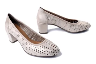 Czółenka damskie. Ażurowa cholewka. Elastyczna lamówka. Miękka wkładka. Wygodny obcas typu klocek.