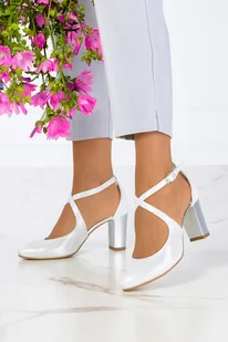 Srebrne czółenka skórzane damskie błyszczące na słupku z paskami na krzyż PRODUKT POLSKI Casu 391-41