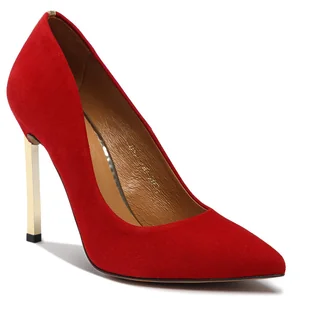 Pełne uroku szpilki z modelu 1044 z pięknym metalicznym obcasem. Te niebanalne czółenka damskie przyciągają wzrok nie tylko nasyconym, ładnym kolorem, ale również jakością wykonania. Zrobiono je z naturalnej, wysokogatunkowej skóry, wytrzymałej, ale i przyjemnej w dotyku i noszeniu. Nie bez znaczenia są również detale, jakimi wykończono buty - trwałe szycie, ciekawie ścięty obcas, czy złocisty pasek poprowadzony na pięcie, jako przedłużenie obcasa. A skoro o nim mowa, mimo dość dużej wysokości (prawie 11 cm), jest on stabilny i dzięki odpowiedniemu ustawieniu wobec podeszwy zapobiega kołysaniu