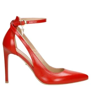 Czółenka na wysokiej szpilce wyprodukowano z najwyższej jakości wytrzymałej skóry licowej, a jako wyjątkowo piękny dekoracyjny akcent zastosowano błyszczący kryształek. Znajduje się on na pasku oplatającym nogę w okolicach kostki. Czółenka osadzono na obcasie w postaci wysokiej na 10,5 cm szpilki, a komfort podczas noszenia zapewniono poprzez zastosowanie podszewki z miękkiej skóry koziej oraz świńskiej. Prezentowany model jest oferowany w rozmiarach 35-41, również w kolorze beżowym oraz czarnym.