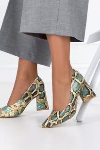 Zielone czółenka skórzane damskie na klocku wzór wężowy PRODUKT POLSKI Casu 3277-36