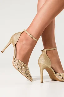 Złote czółenka damskie brokatowe ażurowe z zakrytą piętą pasek wokół kostki kryształki Carla GG-128P