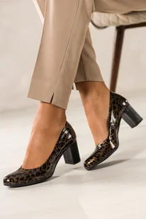 Złote czółenka skórzane damskie lakierowane ozdobny obcas słupek wzór panterki PRODUKT POLSKI Casu 2254