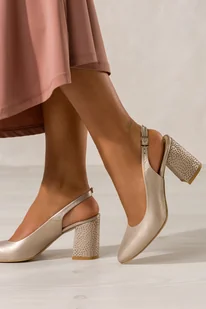 Złote czółenka skórzane damskie na ozdobnym szerokim słupku z odkrytą piętą PRODUKT POLSKI Casu 01501-1814