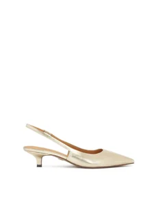 <p>Eleganckie<strong> złote czółenka</strong> na obcasie kitten, które z pewnością zachwycą każdą kobietę. Buty te cechują się noskiem w szpic oraz otwartą piętą, co dodaje im niebanalnego charakteru. Wykonane zostały z wysokiej jakości <strong>skóry licowej</strong>, która gwarantuje ich trwałość i wygodę noszenia. Złote wykończenie dodaje im szyku i elegancji, dzięki czemu idealnie sprawdzą się na wieczorne wyjścia czy uroczyste okazje. Te wyjątkowe buty z pewnośc