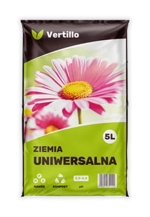 Gotowe, kompletne podłoże, do wygodnej uprawy roślin doniczkowych, balkonowych i ogrodowych. Dzięki starannie dobranym składnikom, takim jak torf wysoki, torf niski, kompost oraz nawóz wieloskładnikowy, Vertillo Ziemia uniwersalna jest żyzna i puszysta. Łatwo magazynuje wodę oraz składniki mineralne a następnie stopniowo je uwalnia, by zaspokoić potrzeby roślin. Rośliny w niej uprawiane mają zdrowe korzenie i widoczne przyrosty.
