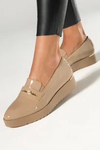 Beżowe półbuty damskie lakierowane slip on na platformie złota ozdoba z kryształkiem casu md7538-3-no-39