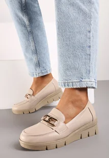 Beżowe Półbuty Mokasyny na Tłoczonym Koturnie ze Skórzaną Wkładką i Aplikacją Rierisa