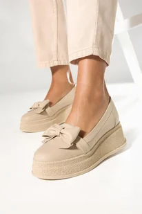 Beżowe półbuty skórzane damskie na koturnie kokarda PRODUKT POLSKI Casu 2728-130-36