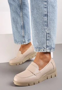 Beżowe Półbuty w Stylu Mokasynów na Koturnie ze Skórzaną Wkładką z Ozdobnym Paskiem Rieva