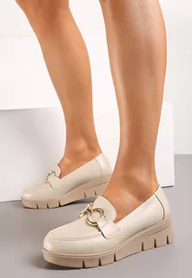 Beżowe Półbuty ze Skórzaną Wkładką na Koturnie z Wycięciami i Metalową Klamrą Lokudia