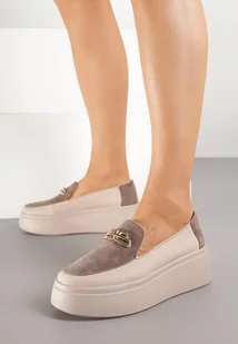 Beżowe Skórzane Półbuty na Koturnie i Platformie z Metaliczną Ozdobą Florgise