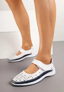 Biało-Granatowe Skórzane Półbuty Ażurowe z Zapięciem na Rzep Eleavienna