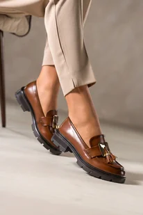 Brązowe mokasyny damskie półbuty z chwostami i złotą ozdobą na bieżnikowanej podeszwie skórzana wkładka Carla K-6-B892