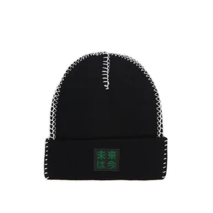 Damska czapka dzianinowa, uszyta z czarnego materiału. Z przodu naszywka z japońskim napisem. Dookoła czapki ozdobne białe obszycie.