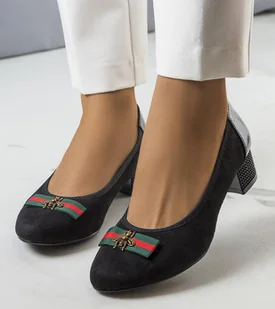 Model Manelia to kobiecy i praktyczny model czółenek na obcasie. Zamszowa skóra ekologiczna oraz akcent lakierowanej eko-skóry zostały wykonane z wysokiej ja...