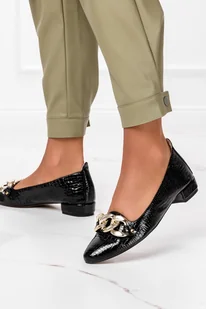 Czarne półbuty lordsy lakierowane ze złotym łańcuchem na niskim obcasie krokodyli wzór POLSKA SKÓRA Casu 4028-L
