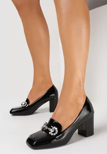 Czarne Lakierowane Czółenka na Obcasie w Stylu Mokasynów z Klamrą Sirelen