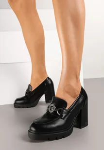 Czarne Półbuty Typu Mokasyny na Słupku Zdobione Aplikacją Felineth