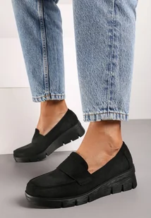 Czarne Półbuty w Stylu Mokasynów na Koturnie ze Skórzaną Wkładką z Ozdobnym Paskiem Rieva