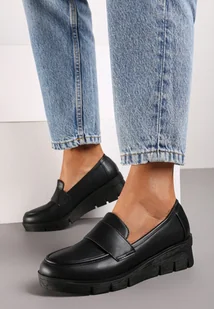 Czarne Półbuty ze Skóry Ekologicznej w Stylu Mokasynów na Koturnie ze Skórzaną Wkładką z Ozdobnym Paskiem Rieva