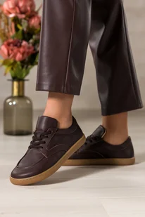 Czekoladowe półbuty barefoot skórzane damskie szerokie na elastycznej płaskiej podeszwie cholewka z przeszyciami czekoladowe sznurówki PRODUKT POLSKI Casu M8669