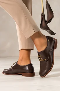 Czekoladowe półbuty skórzane damskie z wzorkiem płaskie złota ozdoba sznurowane PRODUKT POLSKI Casu 5761-SLTO H