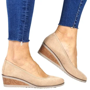 Damskie Półbuty Na Koturnie Mokasyny Potocki 10523 Beżowe Zamszowe
