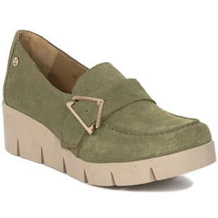 Maciejka Półbuty damskie na platformie skórzane oliwkowe Oryginalne półbuty damskie na platformie to model z kolekcji renomowanej polskiej marki Maciejka. Cholewka wykonana z naturalnej skóry welurowej w kolorze oliwkowym z ciekawą ozdobą w kształcie trójkątnej sprzączki w kolorze złotym na przodzie. Wnętrze, jak i wkładka to skóra naturalna, która znacznie podnosi komfort użytkowania. Podeszwa na klinie o wysokości 5 cm pod piętą z nie tylko wysmukla stopę, ale również całą sylwetkę. Wysokość podeszwy z przodu to 2 cm.
