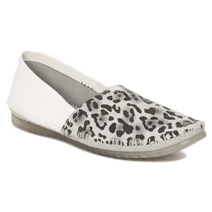 Maciejka Półbuty Damskie Skórzane Białe Maciejka to marka w ofercie której można znaleźć dużą różnorodność – buty w jasnych kolorach albo mocno rzucające się w oczy, klasyczne, gładkie lub bardzo wzorzyste. Ponadto na uwagę zasługuje różnorodność zastosowanych materiałów konstrukcyjnych oraz dodatków, które ozdabiają buty i wyróżniają je spośród innych. Prezentowany model to ewenement wśród półbutów i balerin damskich. Wykonany z bardzo miękkiej skóry naturalnej w kolorze białym z ciekawym, łaciatym wzorem na przodzie. Wnętrze i wkładka to także skóra naturalna.