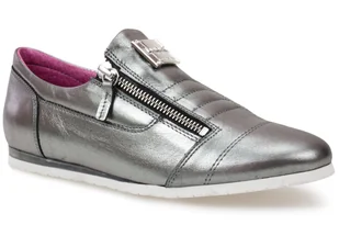 Proponowane półbuty marki Karino wykonane są z naturalnej skóry w najmodniejszym kolorze srebrnym. Podeszwa o grubości 1,5 cm. Wewnątrz znajduje się skórzana wkładka, co dodatkowo podnosi komfort podczas chodzenia. Cechą charakterystyczną są dwa zameczki, które pełnią dwie funkcje. Pierwszą ozdobną, a drugą ułatwiającą wzuwanie butów.