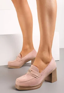 Różowe Półbuty Mokasyny na Wysokim Słupku z Cyrkoniami Remenia