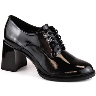 Skórzane lakierowane półbuty damskie na ozdobnym słupku czarne Vinceza 63510