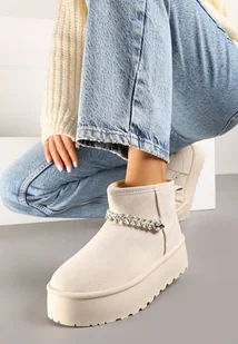 Beżowe Śniegowce z Imitacji Zamszu na Platformie Zdobione Łańcuszkiem z Cyrkoniami Ninnet