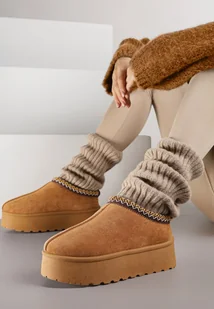 Brązowe Śniegowce z Ekozamszu na Platformie z Niską Cholewką z Ozdobnym Haftem Garvia