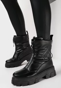 Czarne Śniegowce na Płaskiej Podeszwie z Zamkiem z Przodu i Napisem Bulluna