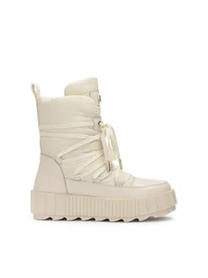 <p>Komfortowe <strong>obuwie zimowe</strong> w klasycznym beżowym kolorze wykonane zostało z wysokiej jakości <strong>skóry licowej</strong> i <strong>tkaniny</strong>. Prezentowany model posiada wysoką cholewkę na zamek ozdobioną na języku naszywką ze złotym monogramem KAZAR. Sznurowadła nie tylko pełnią funkcję ozdobną, ale także umożliwiają idealne dopasowanie butów do własnych preferencji. Płaska podeszwa stanowi świetny izolator od podłoża, a t