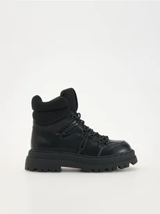 Buty na płaskiej podeszwie z wysoką cholewka wykonane z łączonych materiałów.
