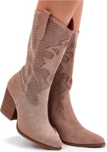 Kozaki kowbojki damskie od marki S. Barski. Wykonane z eko zamszu, łączą elegancję z oryginalnym stylem. Ażurowa cholewka nadająca lekkości i charakteru. Noski w migdał. Zapinane na zamek.