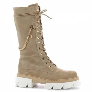 Kozaki na grubej podeszwie z kolekcji by Magda Pieczonka to hit tego sezonu! Nie sposób wyobrazić sobie bardziej komfortowych butów, które pasują do wielu stylizacji. Cholewka została wykonana z wysokogatunkowej, naturalnej skóry. Model posiada solidną podeszwę, która dodaje lekko buntowniczego i wyrazistego wyglądu. Poprzez sznurówki możesz idealnie dopasować buty do szerokości każdej łydki, a od wewnętrznej strony dodatkowo znajduje się suwak, który ułatwia ich zakładanie. Buty posiadają również ozdobę w postaci złotego łańcuszka który w magiczny sposób odmieni Twój