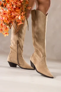 Beżowe kozaki damskie kowbojki z szeroką cholewką na ściętym klocku Casu 0361