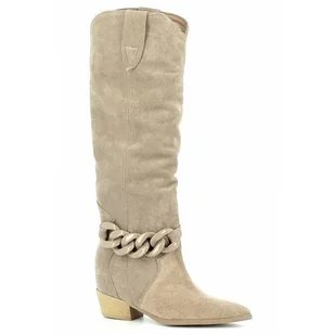 BEŻOWE ZAMSZOWE KOZAKI KOWBOJKI DAMSKIE NA NISKIM OBCASIE I KOTURNIE Z OZDOBĄ