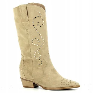 Beżowe kozaki kowbojki damskie CARINII B5681-O17 skóra zamszowa ćwieki r.37